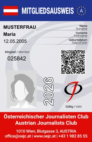 Presseausweis für ordentliche Mitglieder: Die Presseausweiskarte für Journalisten und Journalistinnen zeigt – wie gewohnt – deren Pressezugehörigkeit durch die Aufschrift PRESSE auf der Ausweiskarte und dient als Nachweis ihrer journalistischen Tätigkeit.